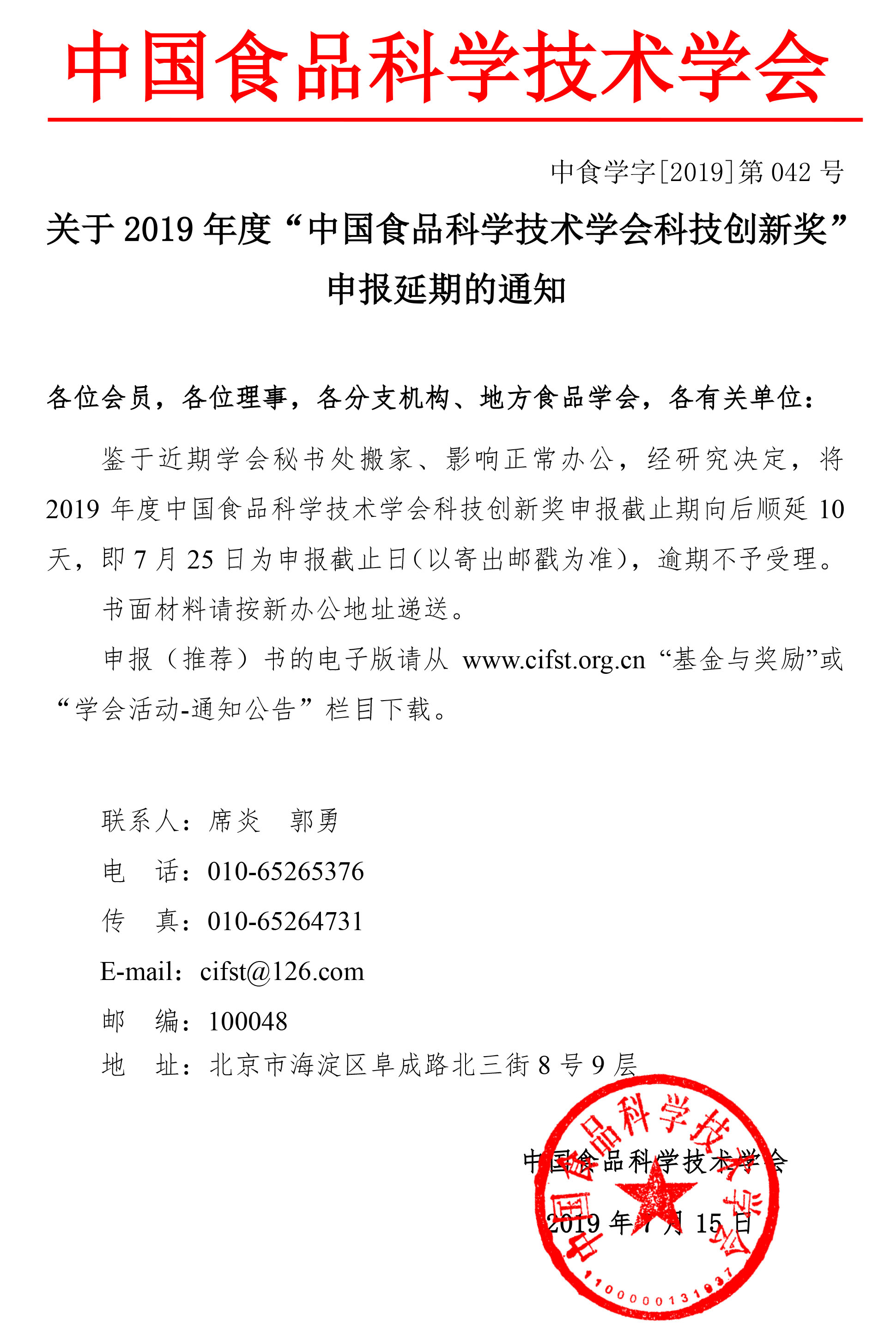 关于2019年度“中国食品科学技术学会科技创新奖”申报延期的通知